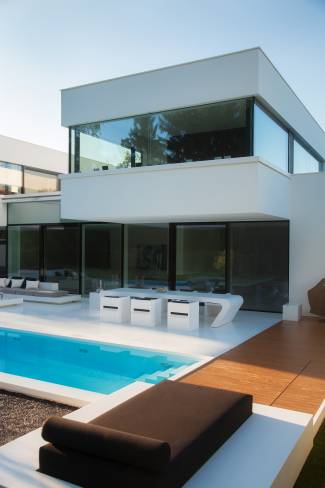 . Die gesamte Außenfläche dient als Wellnessbereich. Minimalismus trifft auf Mineralwerkstoff-Begeisterung. Insgesamt verfügt das zweigeschossige Einfamilienhaus über 152 qm Wohnfläche.